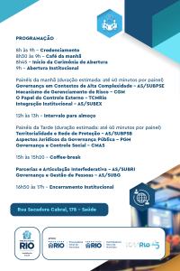 A programação será composta por painéis temáticos com foco nos principais desafios da gestão cotidiana, boas práticas, experiências colaborativas e soluções para o aprimoramento institucional. Além da secretária Martha Rocha e de toda a sua equipe de subsecretários, o evento terá apresentações do subcontrolador de Auditoria e Controle, da CGM, Guilherme Zenha; da presidente do CMAS, Aida Vianna; e da subcoordenadora de Avaliação de Desempenho – Selo de Qualidade TCMRio, Adriane Shibukawa, entre outros.